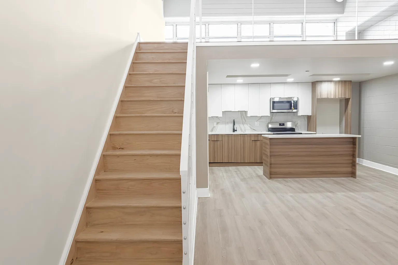 Explore our upscale two-bedroom apartments featuring 10' high ceilings, new bathrooms, and kitchens with white quartz countertops, stainless steel appliances, vinyl wood flooring, and modern finishes.
